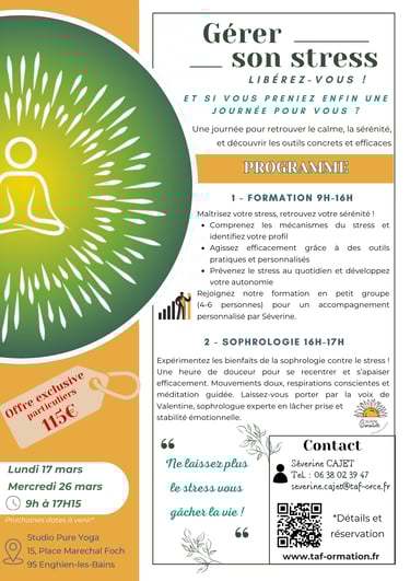 Formation unique "Gérer son stress" les lundi 17 & mercredi 26 mars à Enghien-les-Bains, suivie d' 1h de sophrologie, au tarif exclusivement réservé aux particuliers de 115€ ! Places limitées à 6 personnes par session. Réservez votre place dès maintenant !